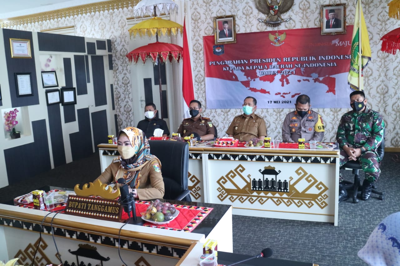 Kota Agung – Bupati Tanggamus Hj. Dewi Handajani, S.E., M.M. mengikuti Rapat Koordinasi tentang Pengarahan Presiden Republik Indonesia (RI) kepada Kepala Daerah se Indonesia Tahun 2021 terkait Covid 19 di Indonesia secara virtual di Ruang Rapat Bupati Tanggamus, Senin (17/5/2021).