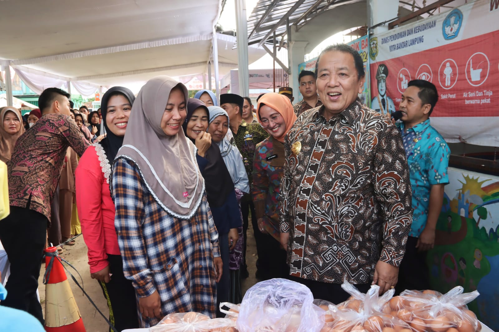Dalam kesempatan tersebut, Gubernur Arinal Djunaidi berkesempatan berdialog dengan masyarakat dan secara langsung melakukan transaksi penjualan telur kepada masyarakat. (Dinas Kominfotik Provinsi Lampung)