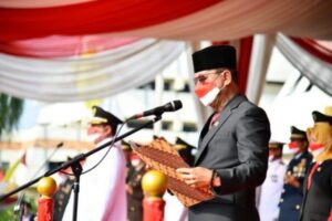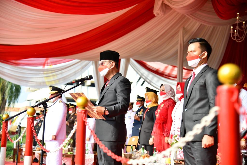Ketua DPRD Provinsi Lampung melakukan pembacaan teks Proklamasi dalam rangka memperingati HUT RI ke 77 dengan tema Pulih Lebih Cepat Bangkit Lebih Kuat di Lapangan Korpri Telukbetung, Rabu (17/8/2022)