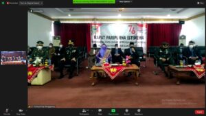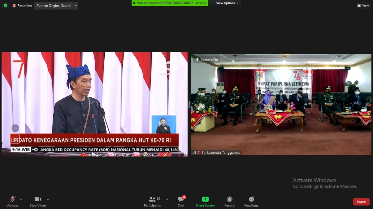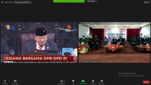 Tanggamus – Sebagai rangkaian kegiatan peringatan HUT Kemerdekaan RI ke 76 Tahun 2021, Bupati dan Forkopimda Kabupaten Tanggamus mengikuti Rapat Paripurna Istimewa DPRD Kabupaten Tanggamus Dalam Rangka Mendengarkan Pidato Kenegaraan Presiden Republik Indonesia Joko Widodo dari Gedung DPR RI, secara virtual meeting di Ruang Rapat Utama Kantor Bupati Tanggamus, Senin (16/8/2021).